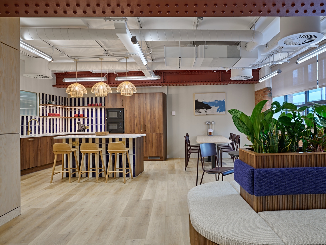 The upgraded kitchen has a playful twist, with a contrasting tile stripe pattern and a layout which promotes collaboration and impromptu chats with colleagues.