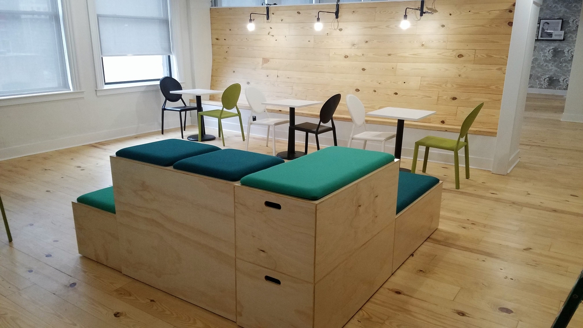 Open plan workstations, accessible meeting areas positioned around a collaborative casual lounge, and a vibrant café where we were pleased to supply our Bleacher seating, forms the perfect new home for the LiveRamp employees. Bleachers are perfect for bridging the gap between a meeting room and an auditorium-style space. With their great flexibility, employees can instantly create the desired environment for any interaction, making a personal, informal space that will foster a flow of inspiration and new ideas.