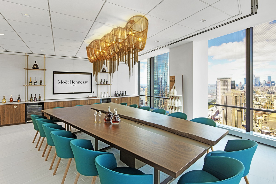 Based in the iconic building at 7 World Trade Center, luxury wine and spirits brand Moët Hennessey's move to downtown Manhattan, has allowed them to create a new workplace bringing together their world-class brands in a dynamic workplace experience. Turning to leading New York architecture firm, TPG, they have crafted the 35th and 36th floors into a space that embodies their collective culture, diversity and accomplishments. An aura of luxury begins right at the reception with effervescent lights, evoking images of champagne bubbles, floating down from the ceiling above.
