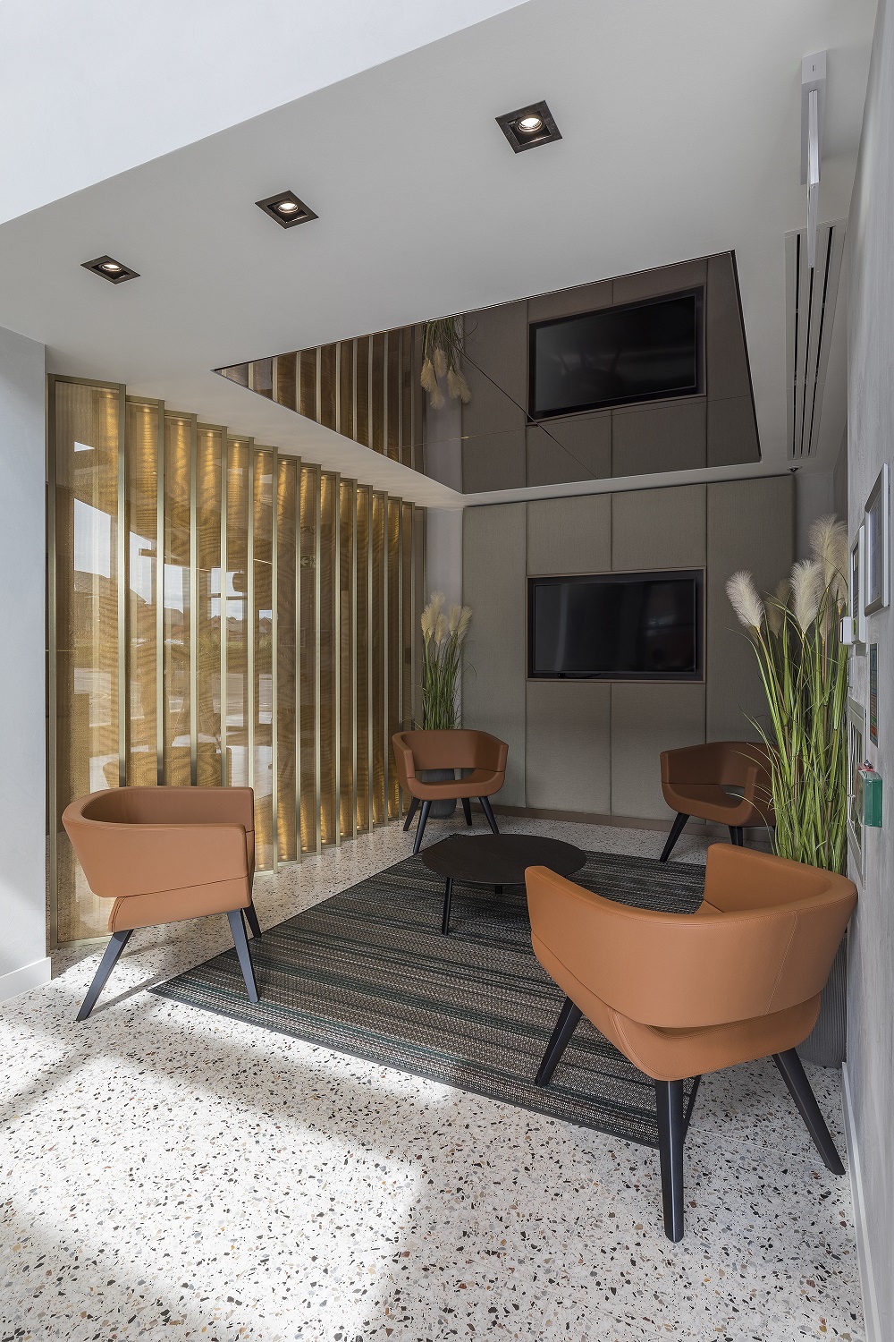 Right from the reception with its dramatic atrium, cascading light feature and moss wall, this stunning space portrays the O'Connor brand in every feature. Warm colours and rich textures such as the copper accents and tan leather upholstery create a homely environment and one that allows employees and clients alike to feel at home. The breakout space on the ground floor continues this 'home' vibe, providing a welcoming and rewarding space for employees to collaborate and socialise. Moving on through the ground floor, an expansive gym, fully-equipped, gives employees the opportunity to exercise on-site and further enhance the employee experience. Dedicated shower, toilet and locker facilities suite in with the quality and feel of the rest of the space.