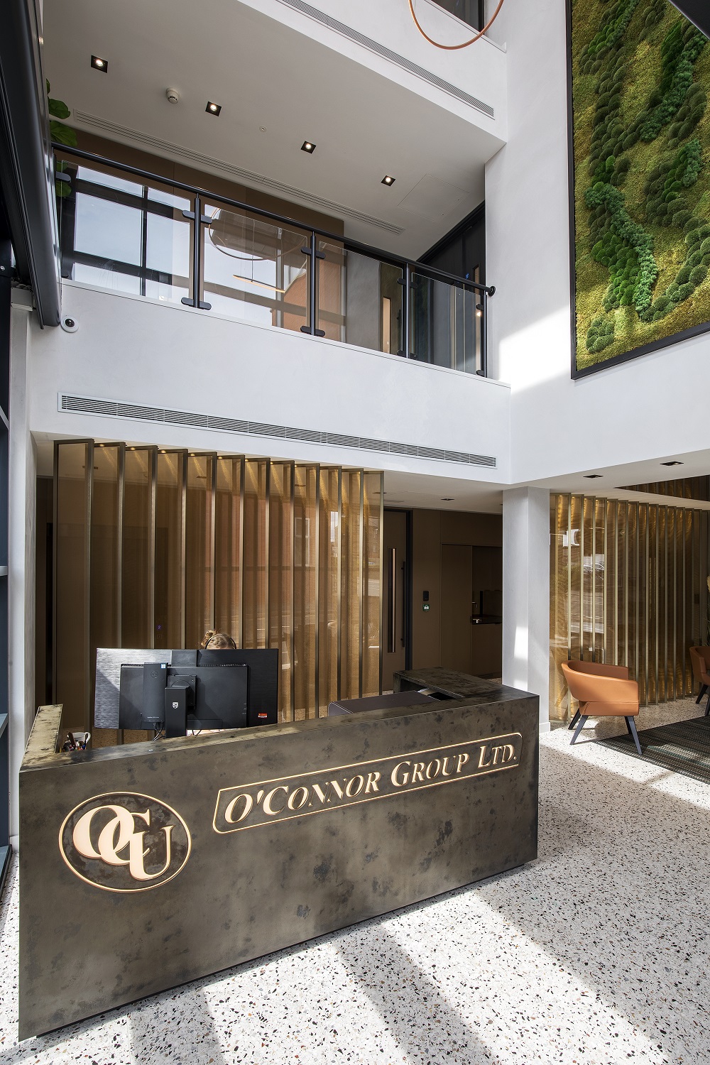 A stunning three-storey transformation for O'Connor Utilities new HQ, featuring warm colours, rich textures and luxurious amenities