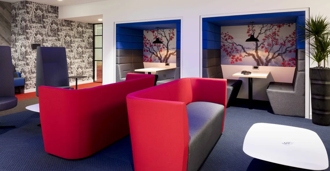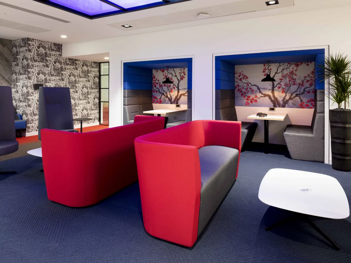 En réponse, Blue jelly a installé d'imenses écrans intelligents 853, une cloison escamotable électrique, un dôme de lumière virtuel qui recrée les différents ciels de différents territoires et en-dessous, grâce à Spacestor, une paire de postes de réunion Railway carriage intégrés avec l'assise revêtue en gris et le plafond en bleu ciel. De plus, en rappel de l'héritage japonais de la société, nous avons décoré le panneau arrière de chaque Carriage avec un imprimé de fleurs de cerisier. Regardez à votre gauche et vous admirez un ciel virtuel, regardez à votre droite et vous vous retrouvez dans un festival "Hanani" de fleurs de cerisier, juste ici à Windsor.