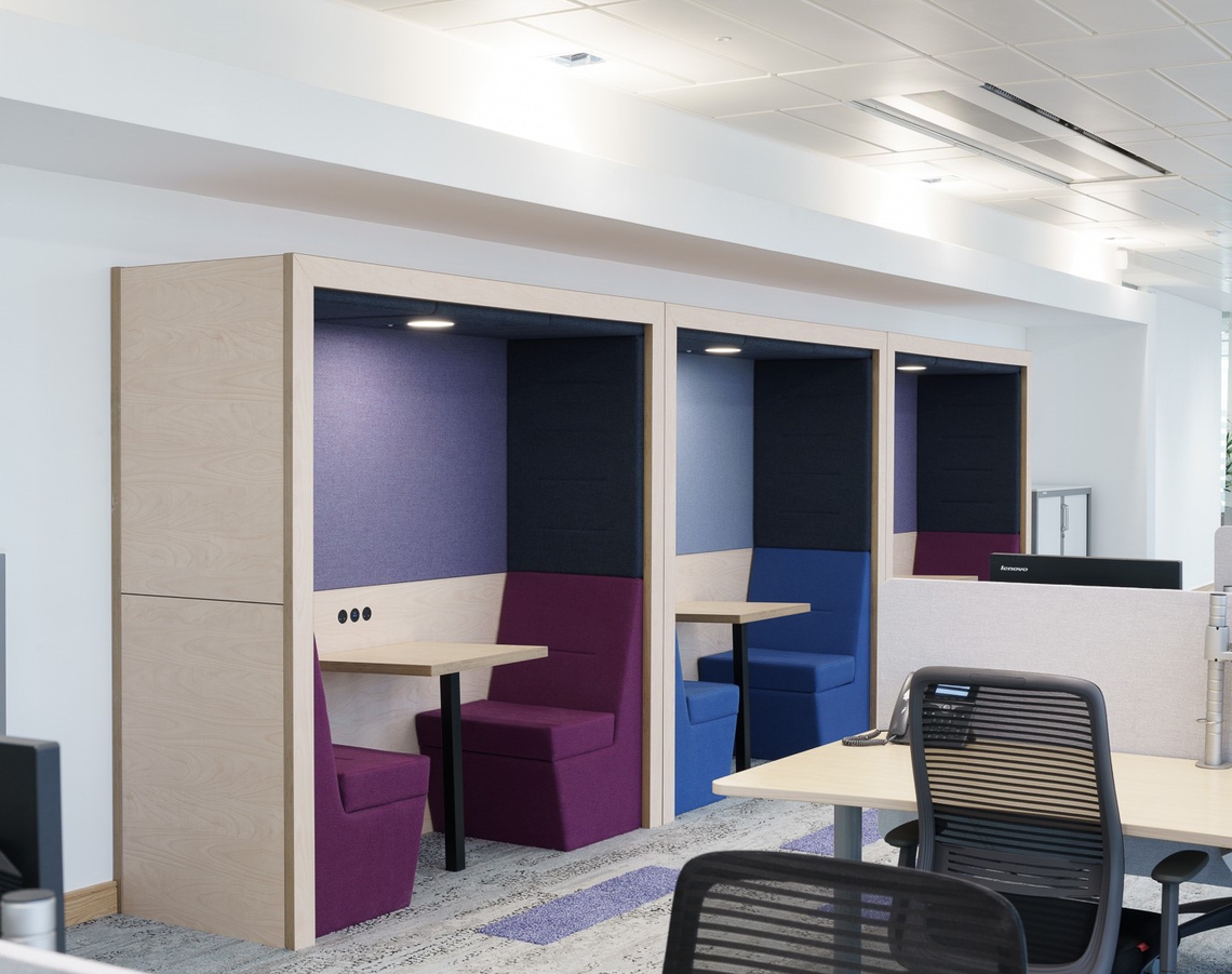 The statement colors are integrated, establishing a corporate feel, with monochromic greys to balance control with creativity. Two-tone Booths enhance this focused blend to establish an optimum environment for productivity. The Railway Carriages create a complete condition for efficient, impromptu meetings and the Portals - a dependable, composed space for distraction-less activity.