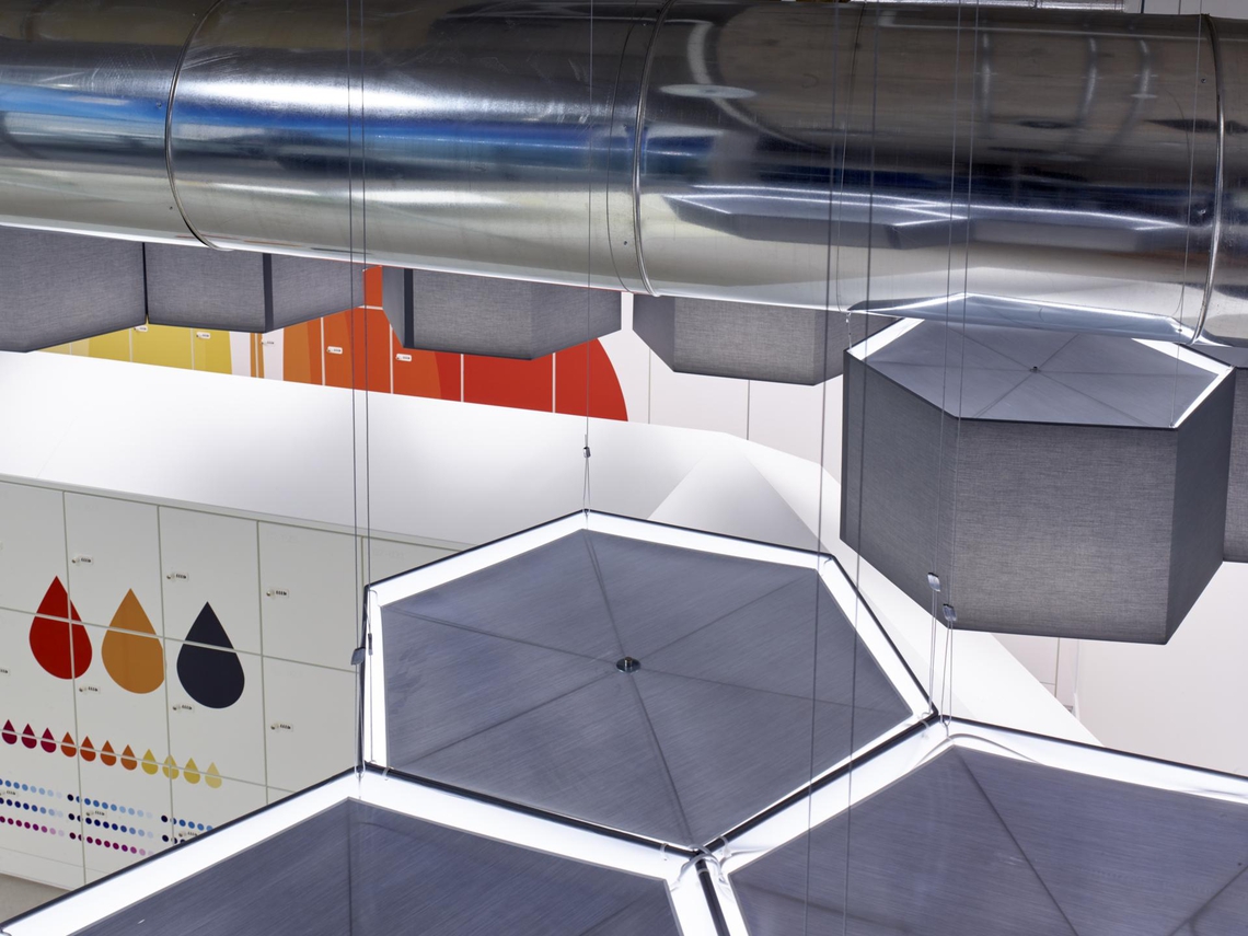 Le concept original de design a été basé sur la création d'un pôle central ou "rûche". L'espace de bureaux environnant représentait le jardin et les employés étaient les abeilles, tout à leur travail. Ceci facilitait le travail flxible, pouvoir se déplacer librement d'un poste à l'autre, permettre la collaboration par le partage des informations et des idées entre collègues. La livraison d'un tel projet a montré une relation forte et une collaboration très proche entre Spacestor et les Architectes Chetswoods, HCS Interiors et l'équipe Sainsbury.