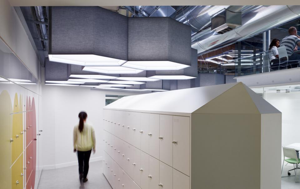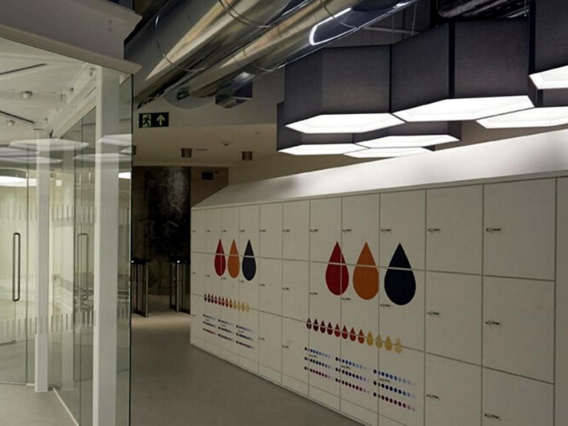 L'un des points essentiels du design étatit la possibilité pôur les employés de travailler depuis n'importe quel point des bureaux. Nos casiers ont offert la possibilité idéale pour les travailleurs de travailler en bureau partagé sans être attaché à un poste particulier où ils auraient dû stocker leurs affaires. Nous avosn conçus, fabriqué et fourni des casiers avec des panneaux d'angle d'extrémité personnalisés et un dessus Clad coudé.