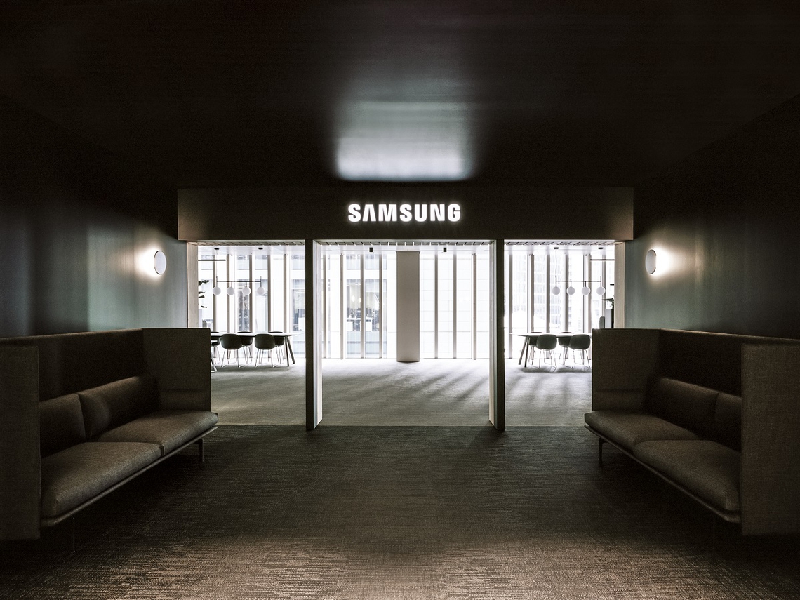 Low lighting and dark materials communicate a dramatic vibe on approach. Like an entrance to another world, there is light at the end of the tunnel and the space opens out into a sunlit expanse. The environment revealed can be strongly associated with Samsung’s Korean heritage – refined materiality and agile minimalism.