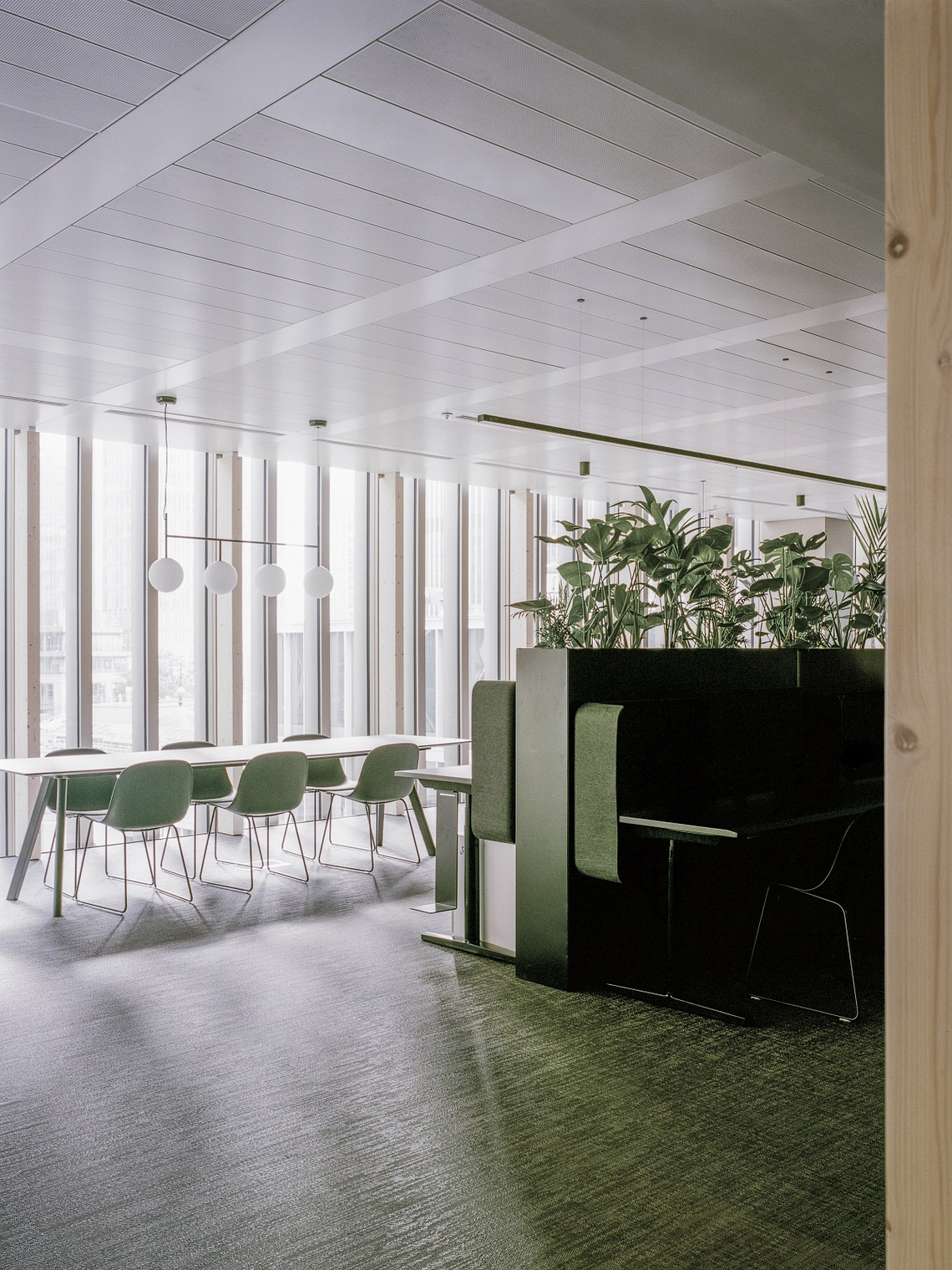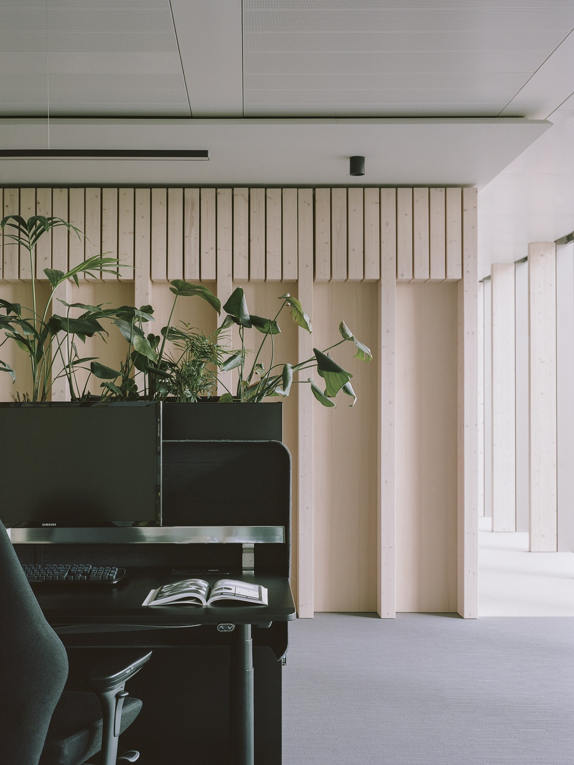 Timber slatted walls of FSC-certified pine split up the space into variable working zones. Spaces to meet privately, to collaborate socially and to work alone. The product design area is connected to the main space stimulating an innovative efficiency, augmented by a proficient storage system. The soft shades of green and presence of biophilia adds softness and warmth, as do floor-to-ceiling curtains. Pared back, content design that paves the way for Samsung’s hybrid, innovative and flexible workforce to build the world’s tomorrow.