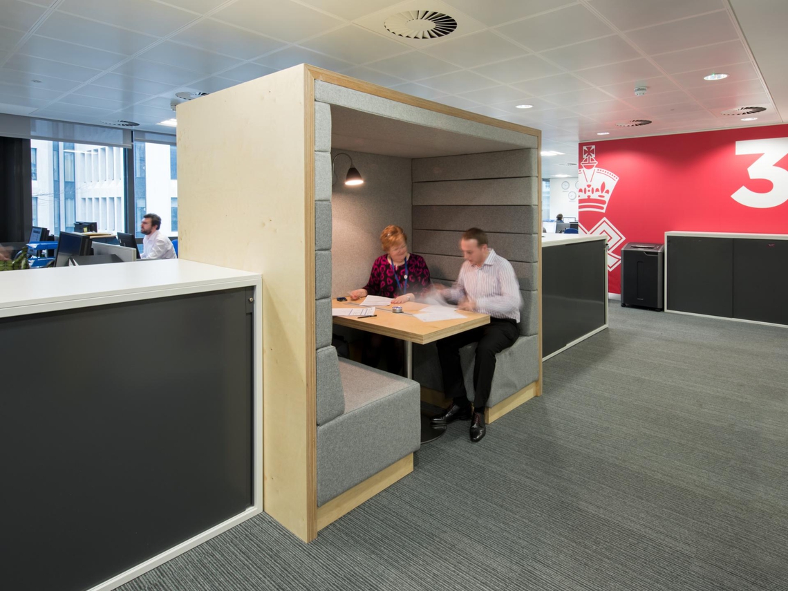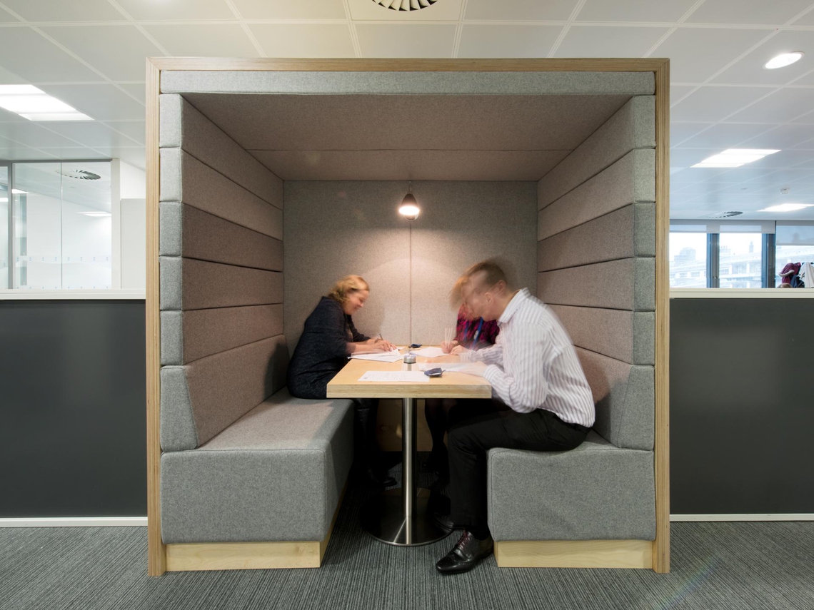 Le résultat a été un espace de travail de style qui semblait avoir toujours été là mais faisait quand même passer son message. Des assises souples confortables avec des bornes d'alimentation et un éclairage ambiant en a fait un espace idéal pour réfléchir ou pour des réunions ciblées. Ca a été mis à l'épreuve immédiatement !