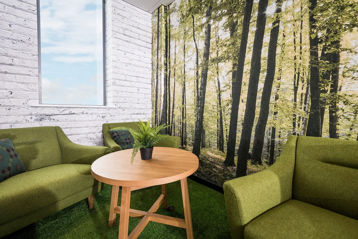 The Park is a space developed from previously unused rooms to create both calming and collaborative spaces, all perpetuating the soft green tones and natural woods which are associated with areas of natural beauty. Whilst offering a place to reflect in picturesque surroundings, The Park also has spaces designated to teamworking and idea generation.