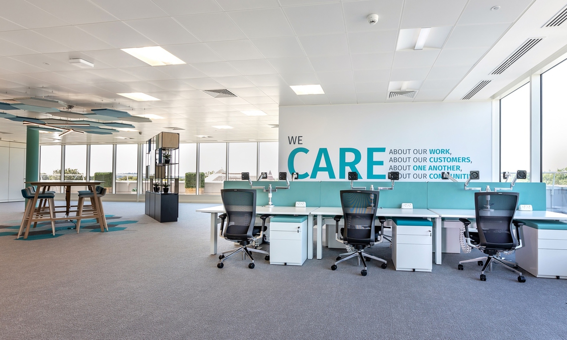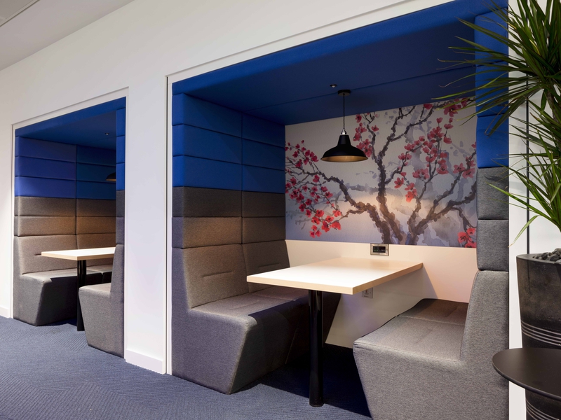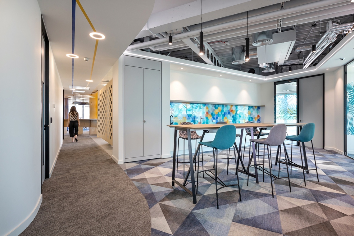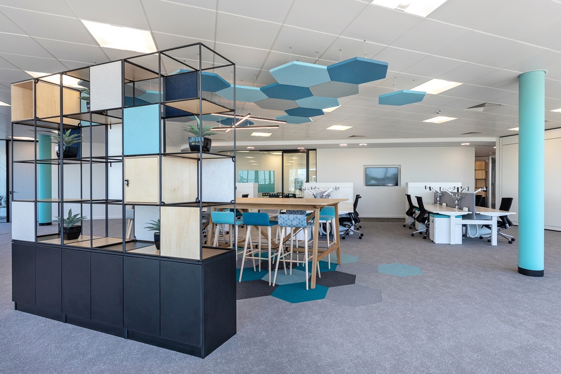 Centred around a hexagonal core, the design aims to create multiple neighbourhoods to promote the new ways of working, focussing on agility and creativity. The Tenable brand has a strong presence throughout the space, with large scale graphics, core values, and bold use of brand colours, providing both permanent and nomadic staff with a sense of belonging to the organisation and the culture. With floor-to-ceiling windows throughout much of the building, the space is flooded with natural light. Blue Jelly took full advantage of this with smart placement of desks to enhance employee wellbeing.