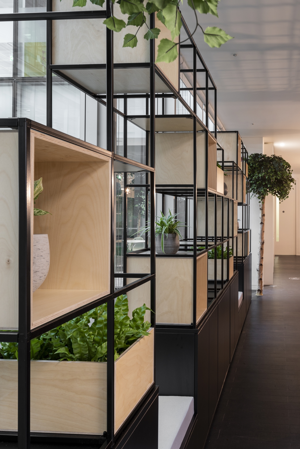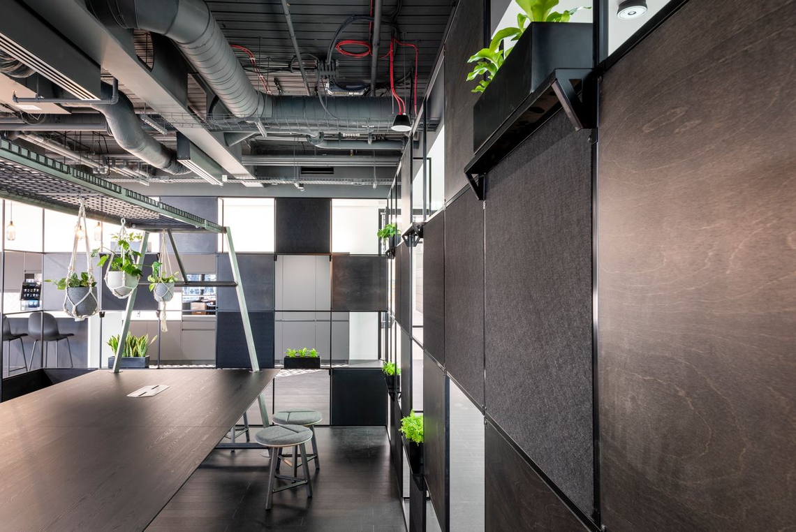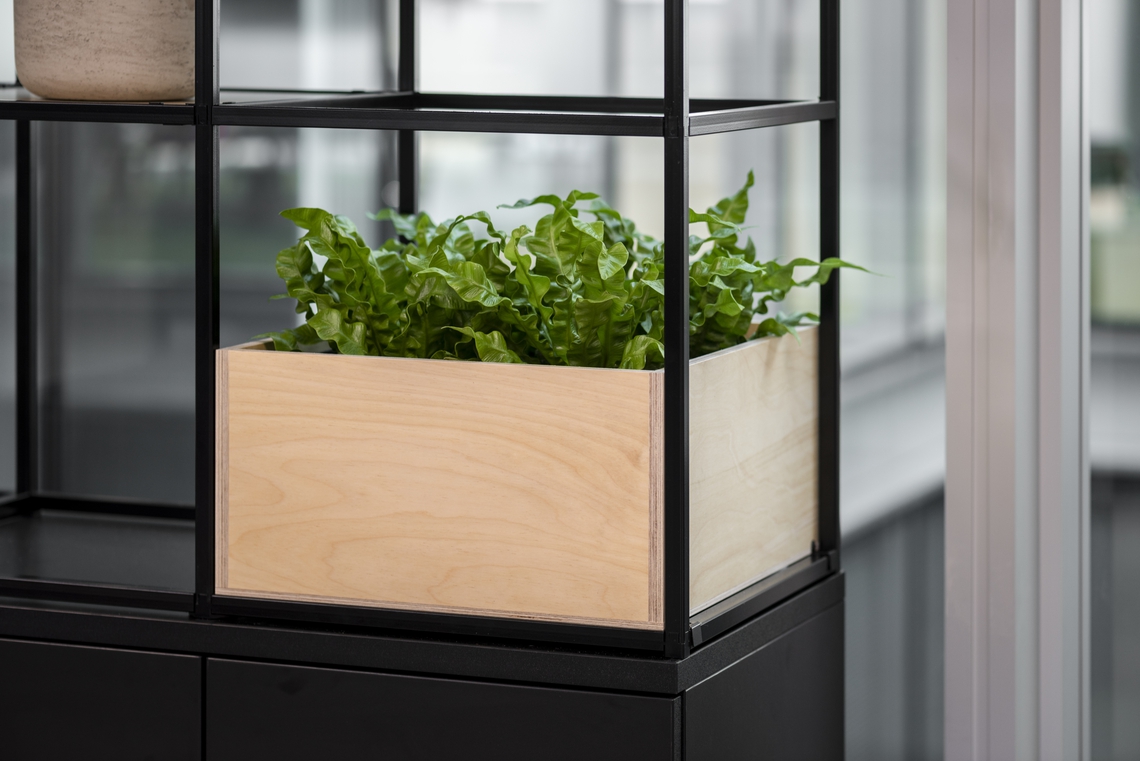 Designed to create a feeling of 'architecture within architecture', a different, 2D style Palisades construction is used elsewhere in the breakout area to essentially create a separate room within the open plan space. With the addition of large acoustic panels, MFC accessories and planting shelves, it provides visual and acoustic privacy to the collaboration area at the centre of the configuration.