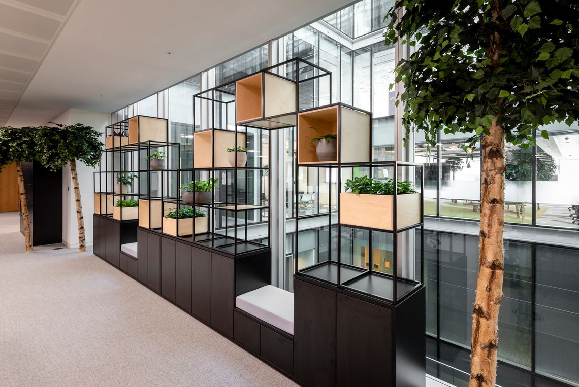 Throughout their breakout area, several configurations of our Palisades II are used to divide and shape the space. With their mid-century design style, the 3D run of Palisades was designed into this space to provide a visual barrier across the central, glass atrium without blocking out the natural sunlight. It also provides additional storage with the cupboards below as well as accommodating additional biophilia. Also incorporated into these custom Palisades pieces are some soft-seating nooks, designed to provide a serene and quiet break. The stepped castellations on the far right and left are designed to fit seamlessly with the blossoming silver birches.