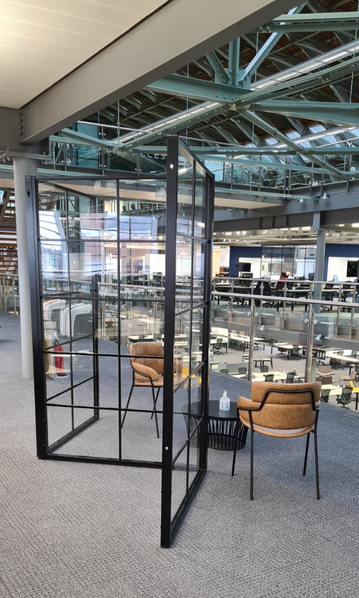 The design of the aircraft hangar, creates the perfect open plan office environment, and is filled with a plethora of break-out and collaboration spaces. The industrial feel is reflected in the furnishings with polished concrete, sleek oak floors, minimalistic lighting and black mid-century crittal style design motifs. Used throughout the space, our Palisades provides the perfect screening solution, to meet the needs of the post-covid workplace, thoughtfully and aesthetically. It makes use of clear panelling to re-enable the human connection with visibility, whilst giving teams the reassurance they need to get back together again safely. Palisades also anticipates the evolving and constantly changing workplace, and it's built-in flexibility means that Very could repurpose their screens into freestanding or other mobile screens at a later date.