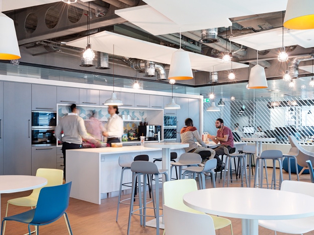 Leur nouvel espace de travail à Londres offre non seulement un grand espace de collaboration et d'interaction sociale, il reflète aussi la nature de l'entreprise, orientée vers la création et la technologie, avec une technologie intégrée de partout.