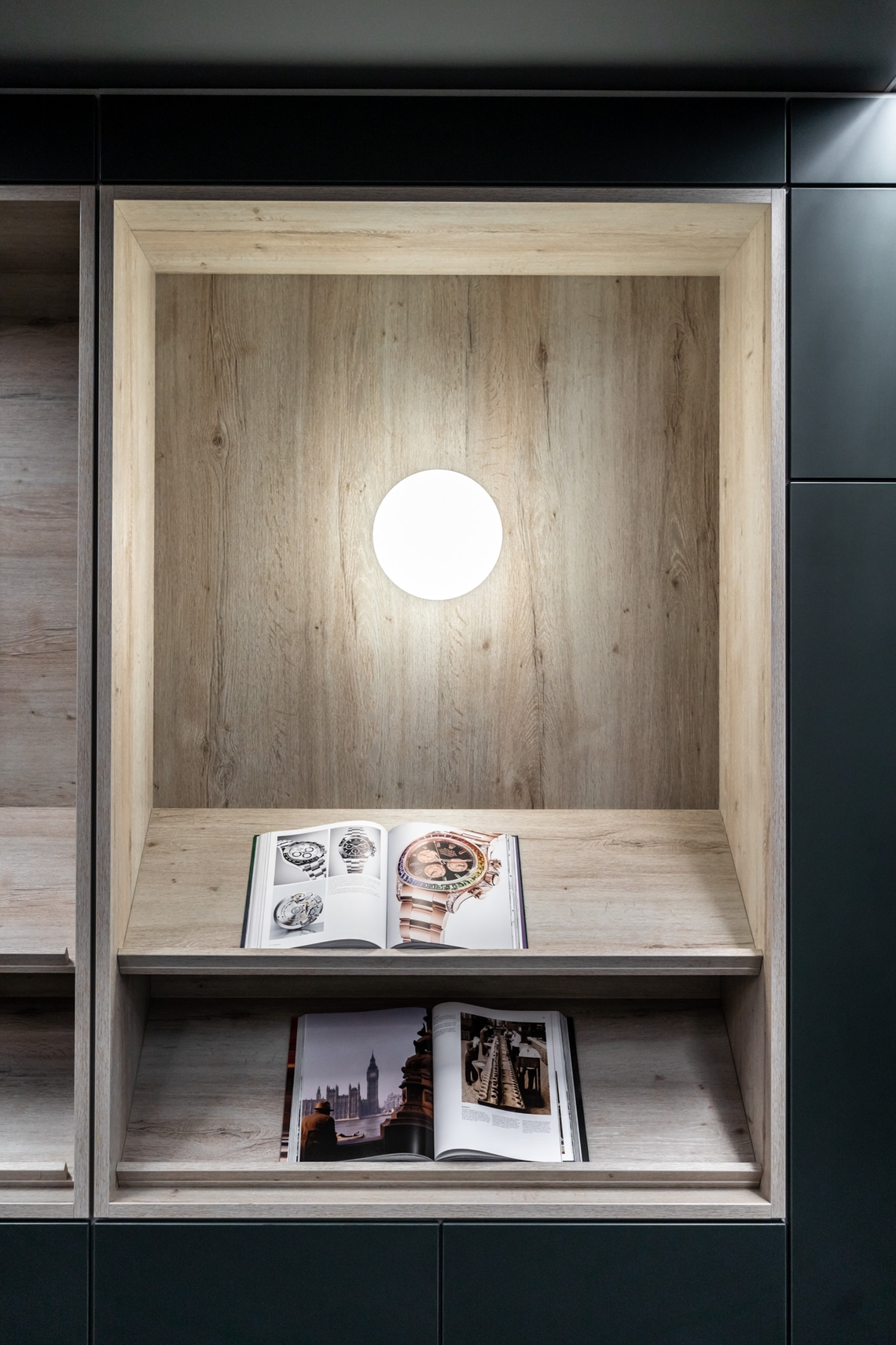 Spacestor’s display Storagewall effortlessly fits into the scheme, featuring integrated soft lighting and a matt finish that harmonizes and blends in well with the earthy tones, rich greens, and soothing blues and teals of the overall colour palette.