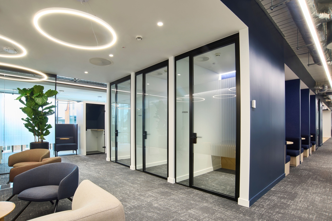 Working with Day2, Spacestor integrated into Portico booths the floorplate, offering users private, acoustically balanced havens for focused work, a quick call or confidential conversations. A sleek yet functional design complements the space, with white frames blending into the backdrop, producing a polished and professional result.