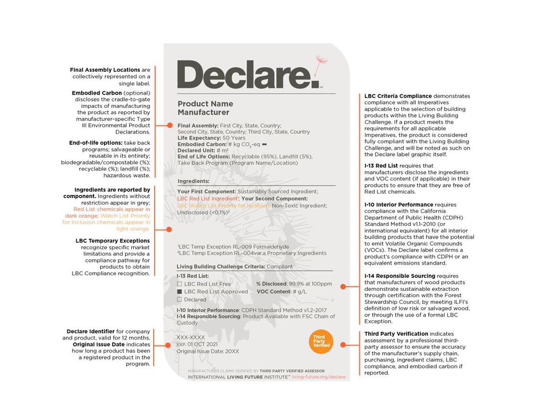 Declare labels, available for download under the documents section of each of our product's resources tab, serve to be transparent and accountable about the materials that each are made of. In a world that demands responsible sourcing, these labels offer detail of all ingredients meaning you can have peace of mind when purchasing any of these products and ensure you can make informed choices to uphold sustainable priorities in projects you are working on.