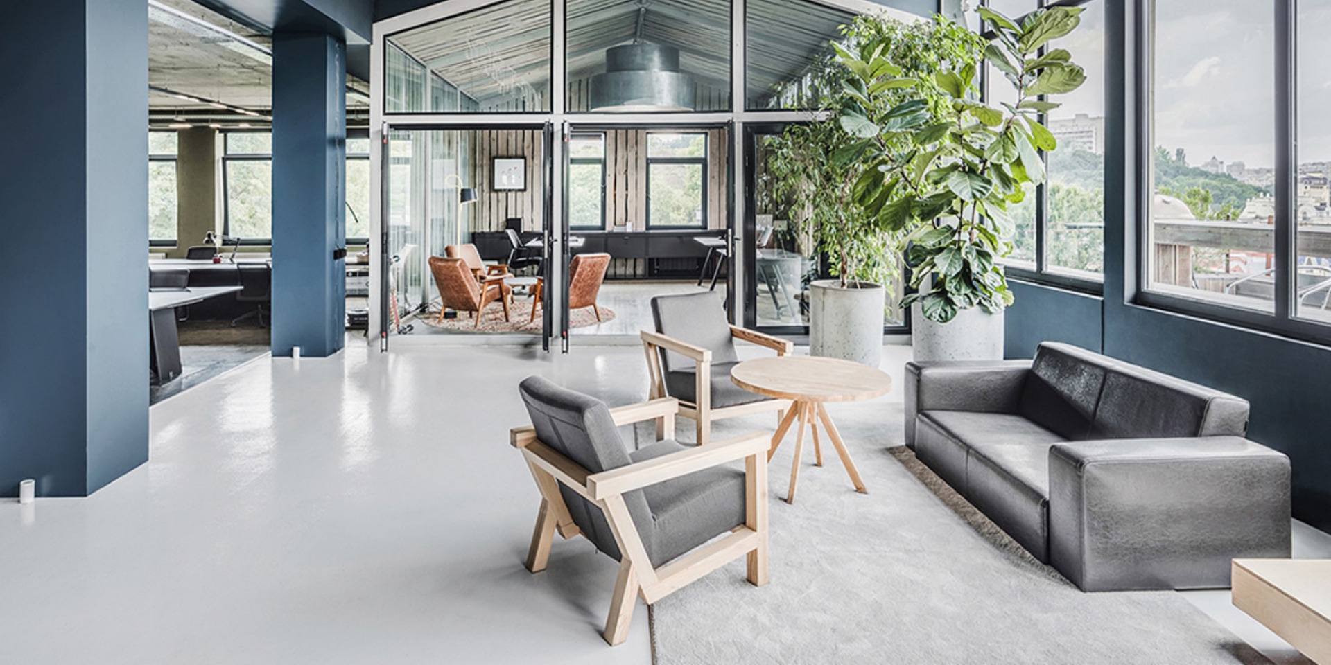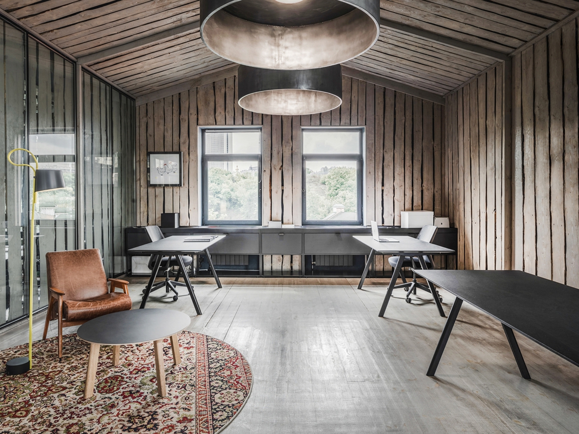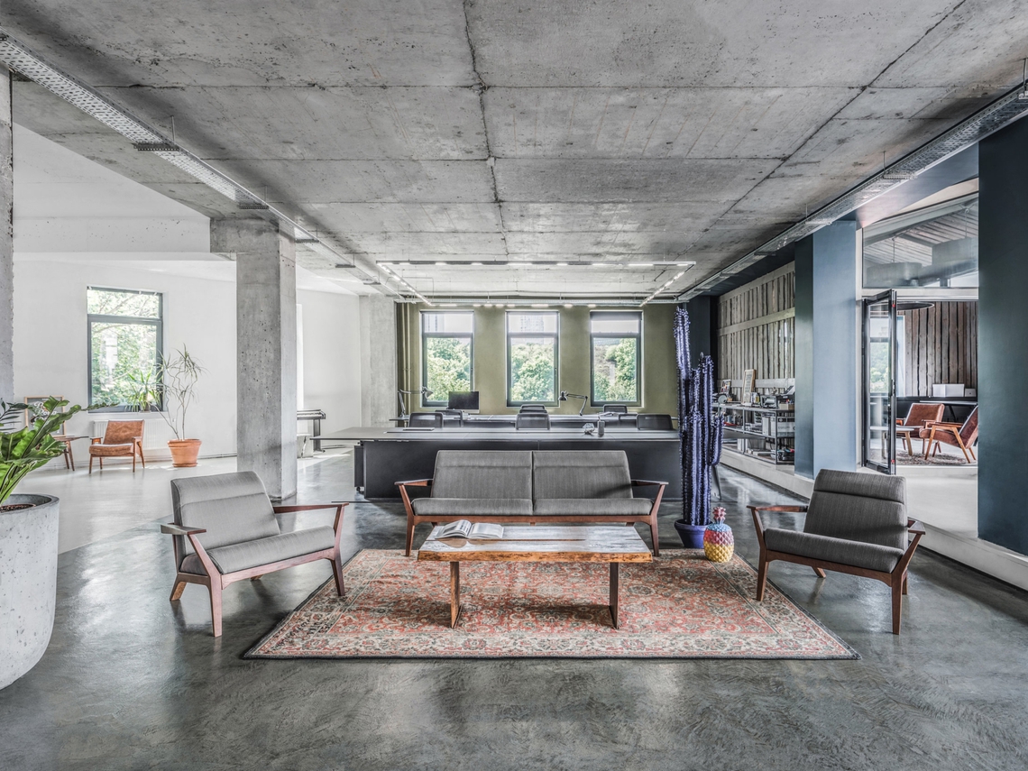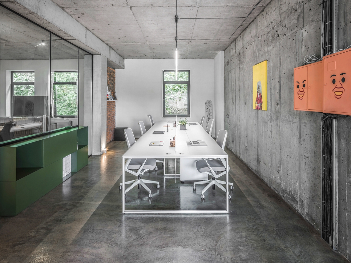 Vintage retro furniture bought at the flea market was restored and partly refinished. The entire office feels open and light, designed in minimalist style with an industrial look.