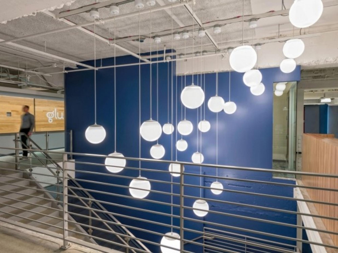 Even in the stairwell, Glu Mobile’s signature logo blue could have made the area dark and dreary, yet the hanging white lights promote a stimulating visual aesthetic; almost like white thought bubbles leading to the next big idea.
