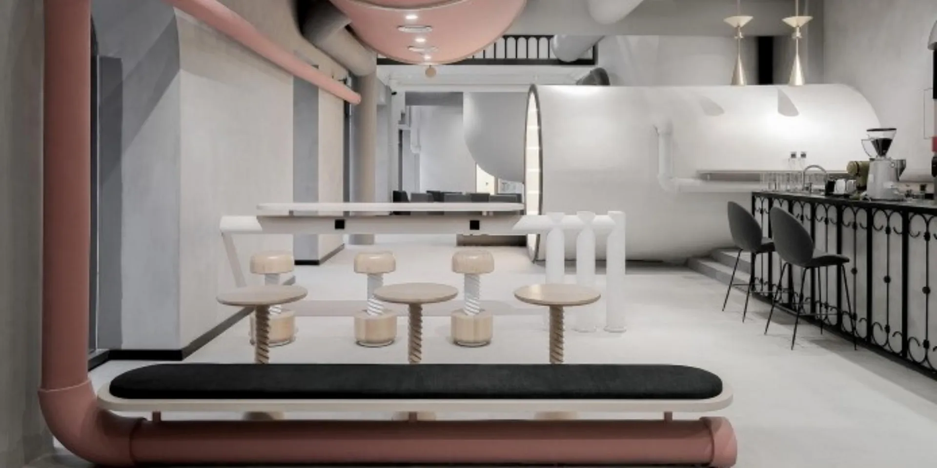 Whilst the palette focuses heavily on monochrome, blush pink paint on the pipes and stairways is expertly used as an accent colour. A variety in texture, shape and height creates an illusion of movement in the room.