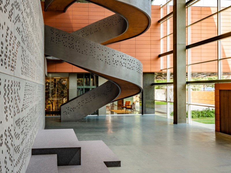 An impressive stairwell spirals asymmetrically and connects the 3 levels of the office. Each level has been designed with a material palette of glass, metallic paint walnut and wood. Cork and concrete accentuate each area differently.