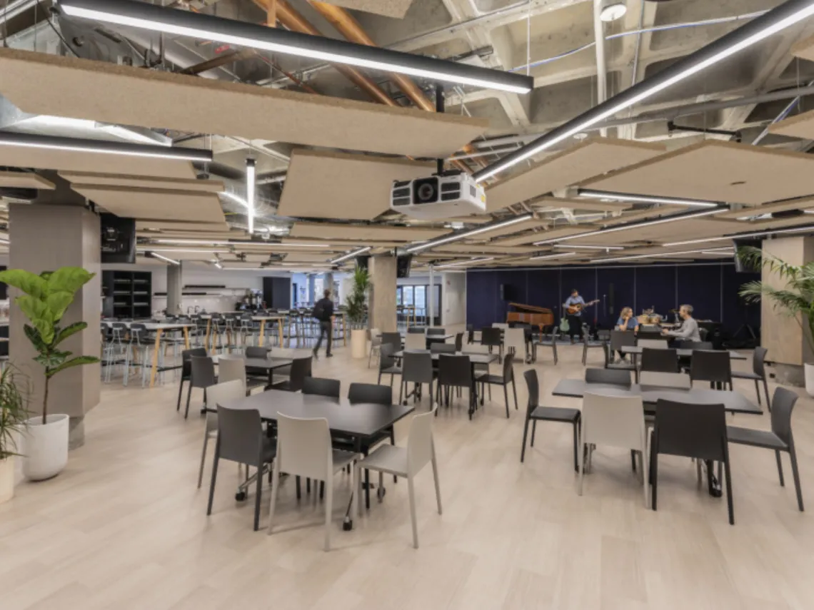 The headquarters serve as a hub for their community of members, with the creative vibe weaving throughout the workplace with the inclusion of art pieces and artifacts from the company's history, along with a performance area and music setup in their café.