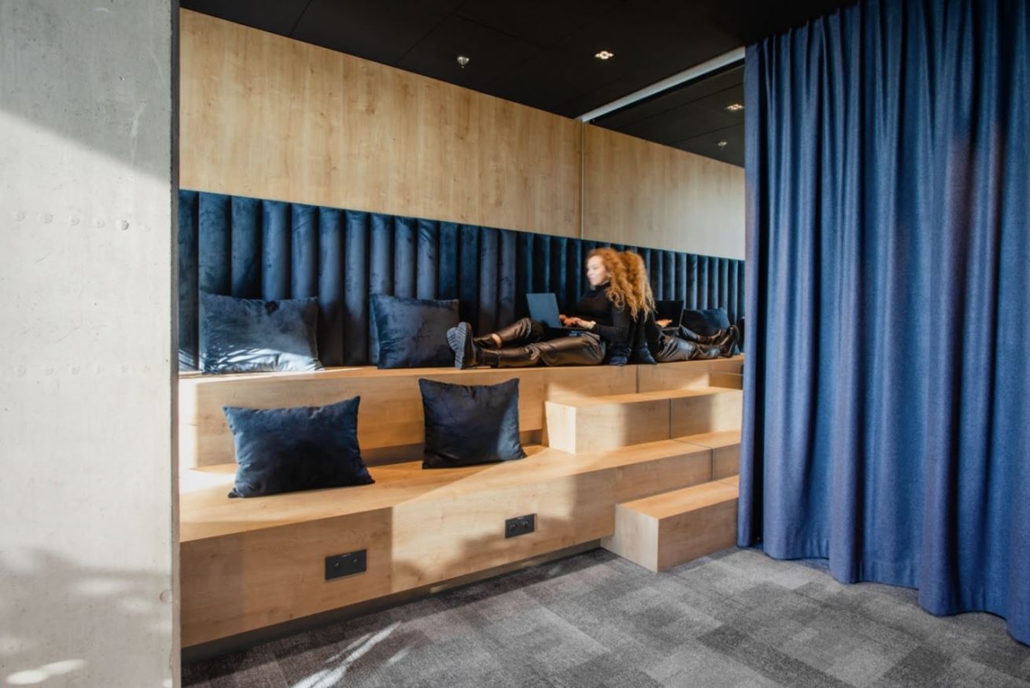 The space on all office floors is well-lit with natural light. Therefore, the arrangement with a dominance of industrial elements does not overwhelm. The designers from The Design Group made sure the office wouldn’t lack accents that warm up the interior and make it more welcoming. A good example of this is the PwC SDC coffee points on each floor. With their style, they bring in a casual café ambiance. Of course, distinctive elements of the rest of the office are present – there are brick walls, black veneer, and ribbed glass cabinet fronts. Upholstered chairs and armchairs in warm colours, a soft sofa, or coffee tables in a natural wood colour are also present. The design even invokes a homely atmosphere with a spruce pattern on the wooden floor.
