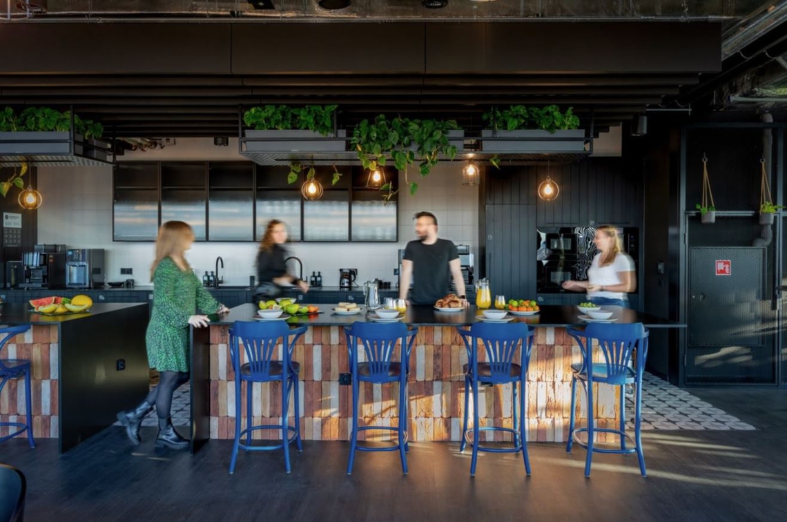 Similarly, the industrial code of the PwC SDC office arrangement is broken by the kitchen occupying almost half of the 9th floor. It is the only such space in the entire office. In a way, it forces employees to interact with others, encouraging integration. This place was designed as a meeting space, and its centerpiece is a large table. Arrangement elements that soften the industrial interior are also present here – upholstered sofas, chairs, and armchairs in various colours. There are also many live plants, and the kitchen leads to a spacious terrace with a panoramic view of Katowice.