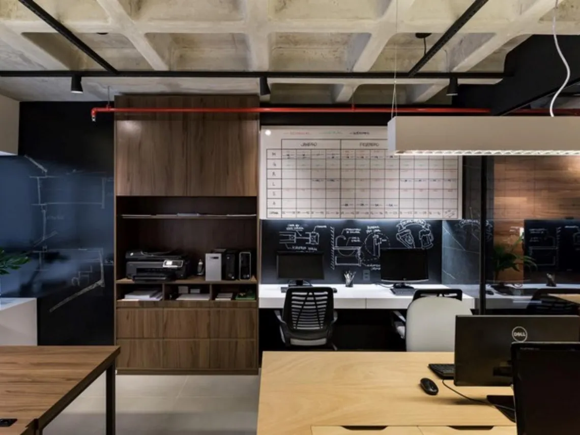 Raw brick walls, low hung lighting strips and concrete ceilings create a cosy yet functional workspace for the Brazilian architect firm, Seferin Arquitetura
