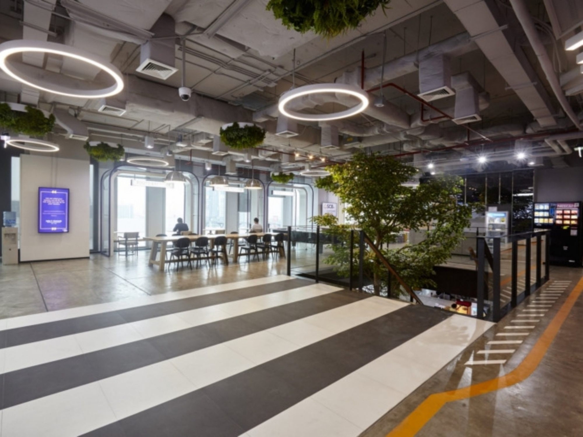 The design concept is “urban tech” as the business’s nature is all about technology, connection and the community. So, the design was integrated by using urban elements, for example street seating, a large tree and road markings. Furthermore, the overall look and feel for SCB contact centre incorporated rustic materials, for example, a concrete vinyl floor, exposed ceilings, and the use of wood and metal features.