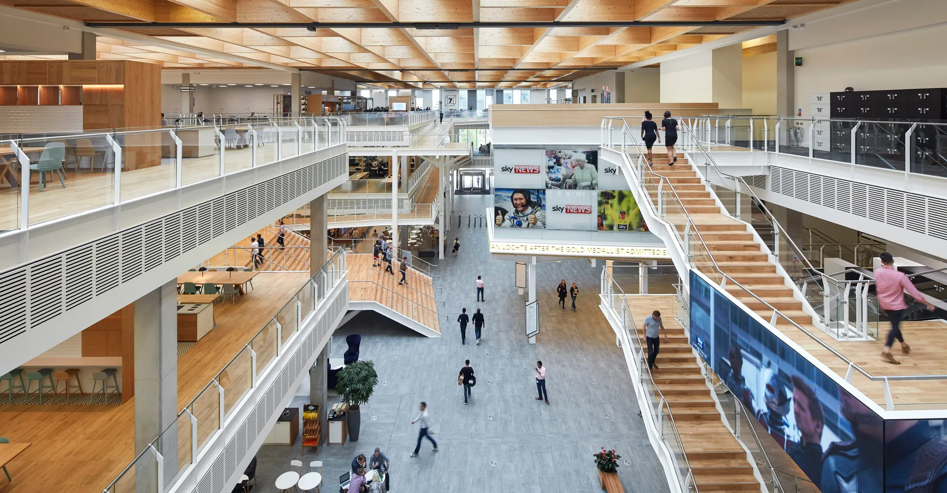 With so many employees to retain, Sky has introduced a range of areas that cater to the needs of corporate and creative staff amongst the large mezzanine floors. This new large three-story building houses over 3,500 employees with a spacious design and wood finishes throughout with levels filled with informal seating arrangements - encouraging staff from all departments to interact and collaborate.