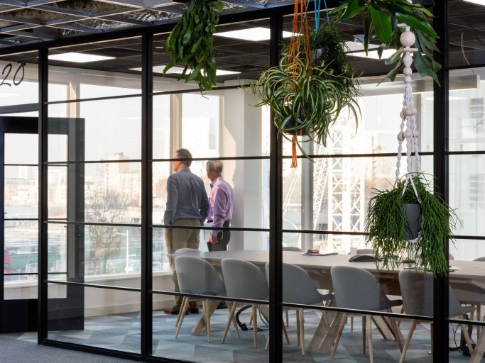 They were asked to create a Brooklyn Loft feel in a 1980s Canary Wharf office building. They began by stripping back the Cat A finishes; popping out the mineral fibre ceiling tiles but leaving the grid, pulling up the carpet tiles to expose the patinated access floor, and spraying the grid and tiles matte black in the cellular spaces. Then they layered a variety of finishes over this stripped back base to add color, texture and pattern. The project was completed from brief to build in only three months to the great satisfaction of staff and stakeholders alike.