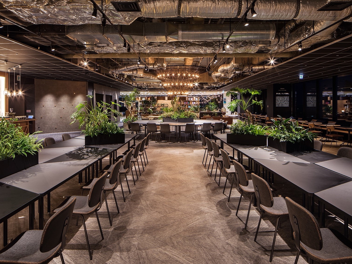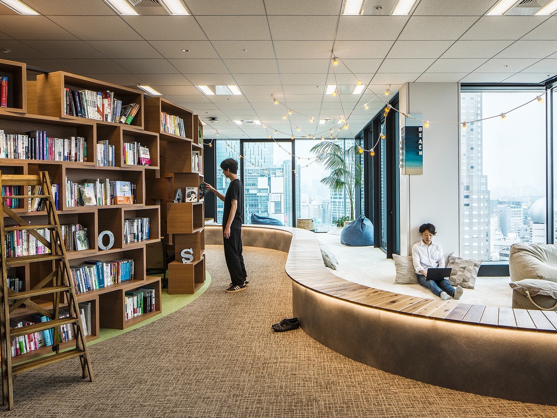 Upon entering, in the centre of the stunning space is the company bar Ajito. Each area in the space is connected seamlessly, the café space Lagoon with it's flexible layout, the company library Oasis which doubles up as a concentration space. Hill and Beach are areas where visitors can relax.