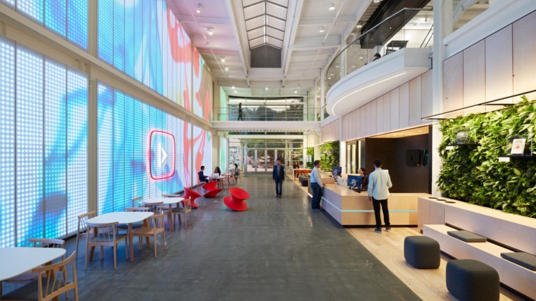 YouTube's famous "play" icon is outlined in neon in the center of the LED wall. The northern side of the lobby is lined with pockets of green wall, stacked wooden benches and high table seating.