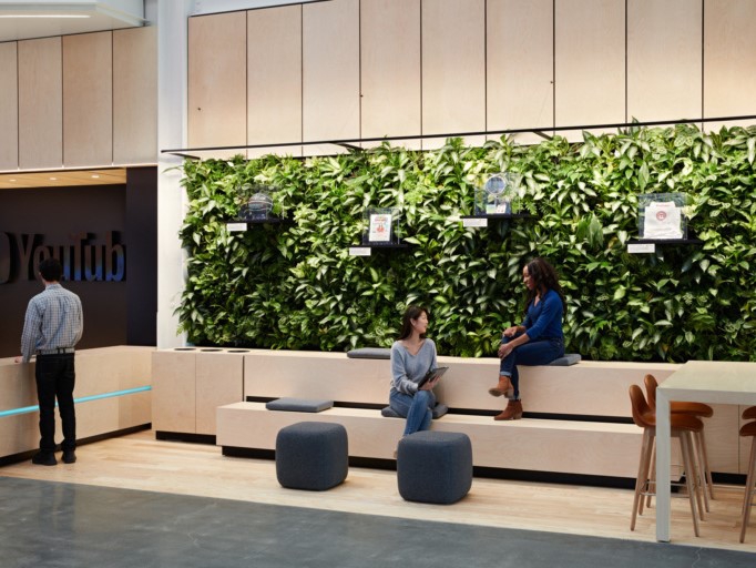 Elements of biophilia support employee wellness whilst complimenting the natural wooden textures throughout the space. A series of floor "medallions" encourage visitors to interact with the digital installation. Each medallion is a graphic describing one of YouTube's core values. Stepping on one triggers a reaction on the digital wall, and activating multiple medallions in different combinations gets different responses. The lobby, much like YouTube's online platform is designed to foster creativity, exploration and discovery.