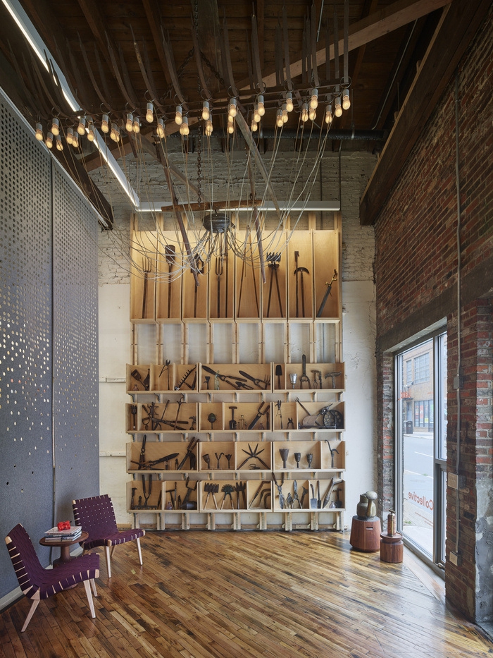 Responding to the cultural ethos of the studio’s surrounding neighbourhood, the light-filled volume set behind the public street façade introduced a gallery space featuring a collection of antique gardening implements displayed on a modular wood shelving system and rotating art installations by local artists.