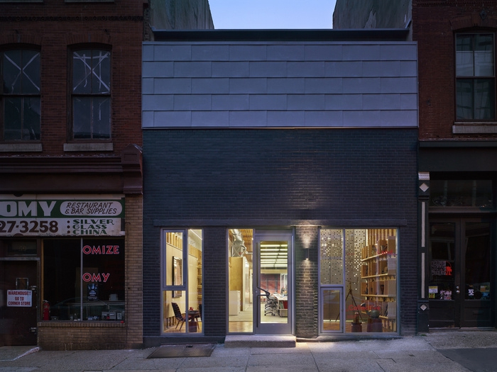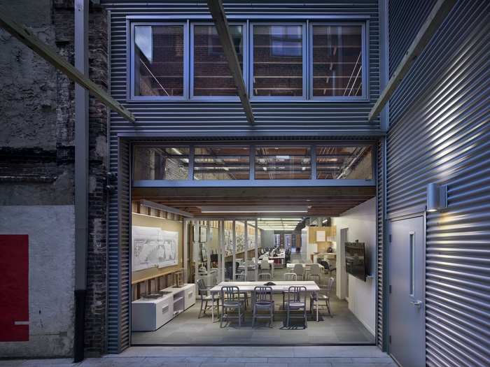 A second-floor studio space supported by new engineered wood floor framing has been added over the rear two-thirds of the existing structure. The new second floor incorporated flexible open and closed office spaces, and a tiered meeting area, which opens out to a planted roof terrace set over existing timber roof framing with views to the Old City streetscape beyond. Images taken from Office Snapshots