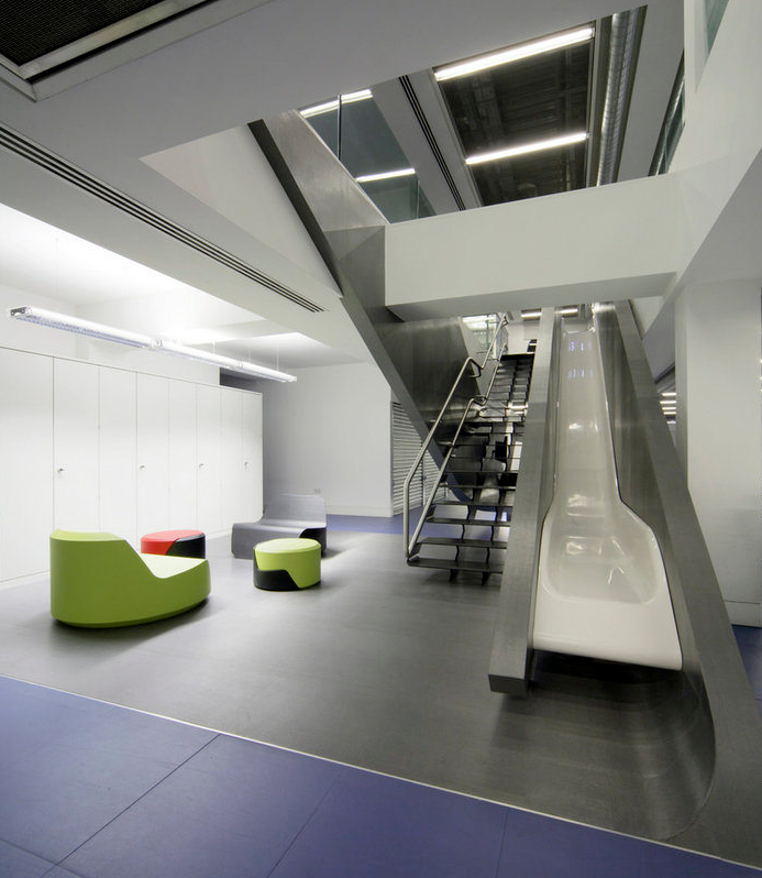This office was renovated to encourage interaction between employees while communicating the company’s brand values and identity, which it does with style. By bringing back the fun, Red Bull has helped make 9 - 5 a more enjoyable, youth-inspired experience.