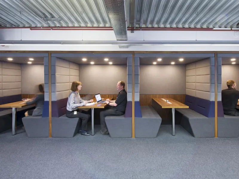 At the heart of the design is a stepped outdoor theatre of seating and plants; the design of which is also mirrored indoors in a small stepped lecture hall. Above ground the complex feels like a green university campus, but underneath, kept bright and airy by spacious lightwells, is a variety of workspaces: a large shared coworking space divided up by cabinets and bookshelves, and quiet private offices by the light-filled atrium and the natural rock wall left behind from when the site was blasted.