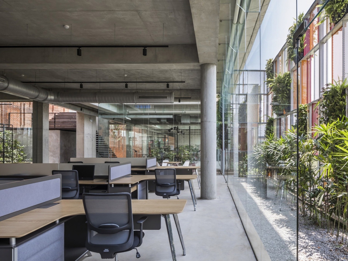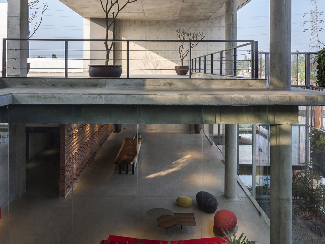 A background of cold concrete and textured red brick are contrasted together around the building, leaving the structure visible wherever possible. The rustic and discreet material palette aligns beauty of industrial with the site context. Being a corporate office and factory setup within the same campus (in fact adjoining each other), the use of the raw, earthy theme has allowed them to bring the two sections of the building closer together.