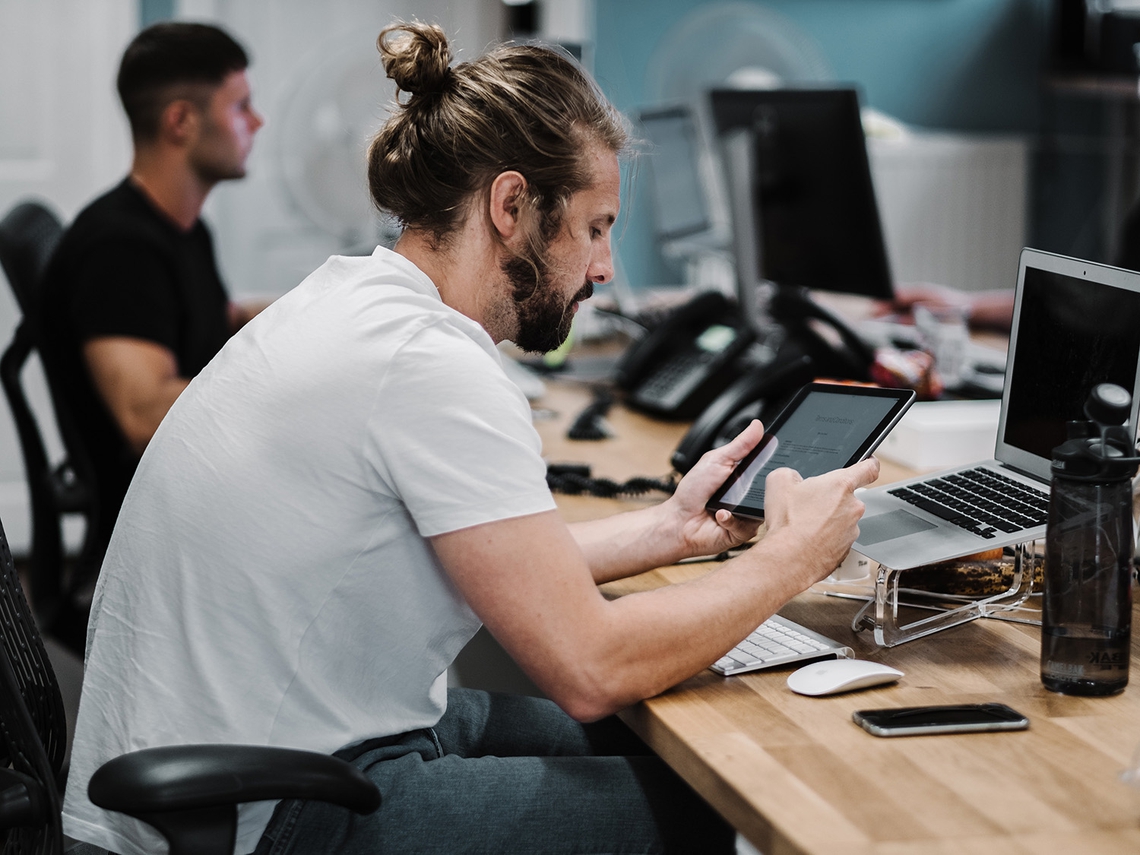 Good posture is incredibly important. Today there’s an epidemic of laptop and tablet posture: hunched over, shrugged shoulders, head craned forwards. Luckily, a comfortable, ergonomic working environment can work wonders: choose a good office chair, perhaps with an added lumbar support, and make sure your desk and your monitor are at a good height. Likewise, if you’re looking at your phone, hold it up to your face, don’t keep it in your lap.