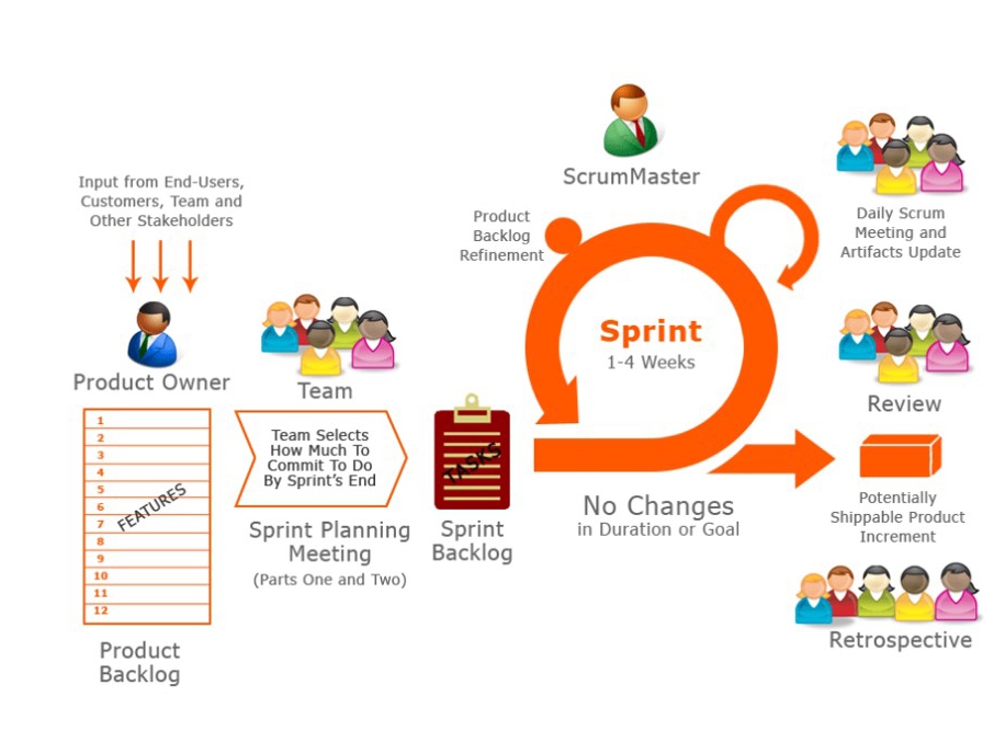 Sprint: the Product Backlog will be broken into a series of goals, each to be completed in a working Sprint of usually between 2 and 4 weeks. Crucially, the goal and the duration of the Sprint cannot be changed once it’s underway.