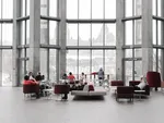The last room, “Transformative”, featured more muted natural tones of steel and wood and leather in order to create a cooler effect. Shades of green and blue are also thought of as cool colours. They bring the natural world of meadows and rivers and lakes to mind and help you to relax. The colour blue, for instance, helps to slow down your breathing and lower your blood pressure, so it’s great for reducing stress at work. Having office plants and views of natural landscapes also has a beneficial effect on our moods of course: not only do indoor plants improve air quality, they can also reduce the number of sick days and raise productivity.