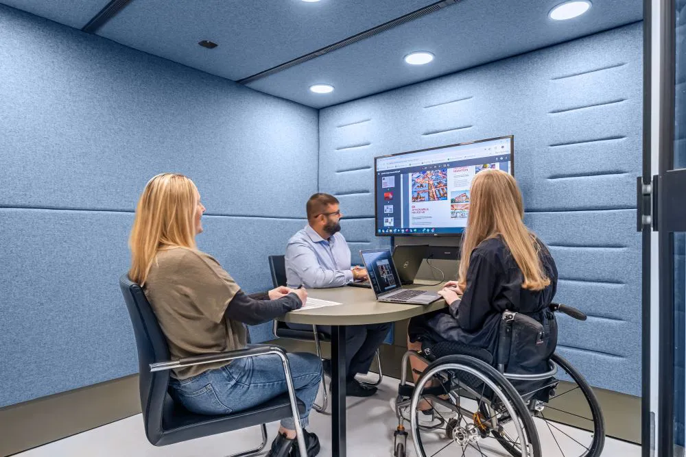 Portals Room addresses these challenges by delivering a space-efficient, customizable meeting room that effortlessly adapts to various needs. Designed to accommodate meetings of four to six people or serve as an exclusive solo office space, Portals Room is equipped with integrated power and charging options, user-adjustable lighting, a table, and a screen. This plug-and-play solution ensures private collaboration and a seamless meeting experience, making it an ideal choice when supporting dynamic demands of a global workplace strategy.