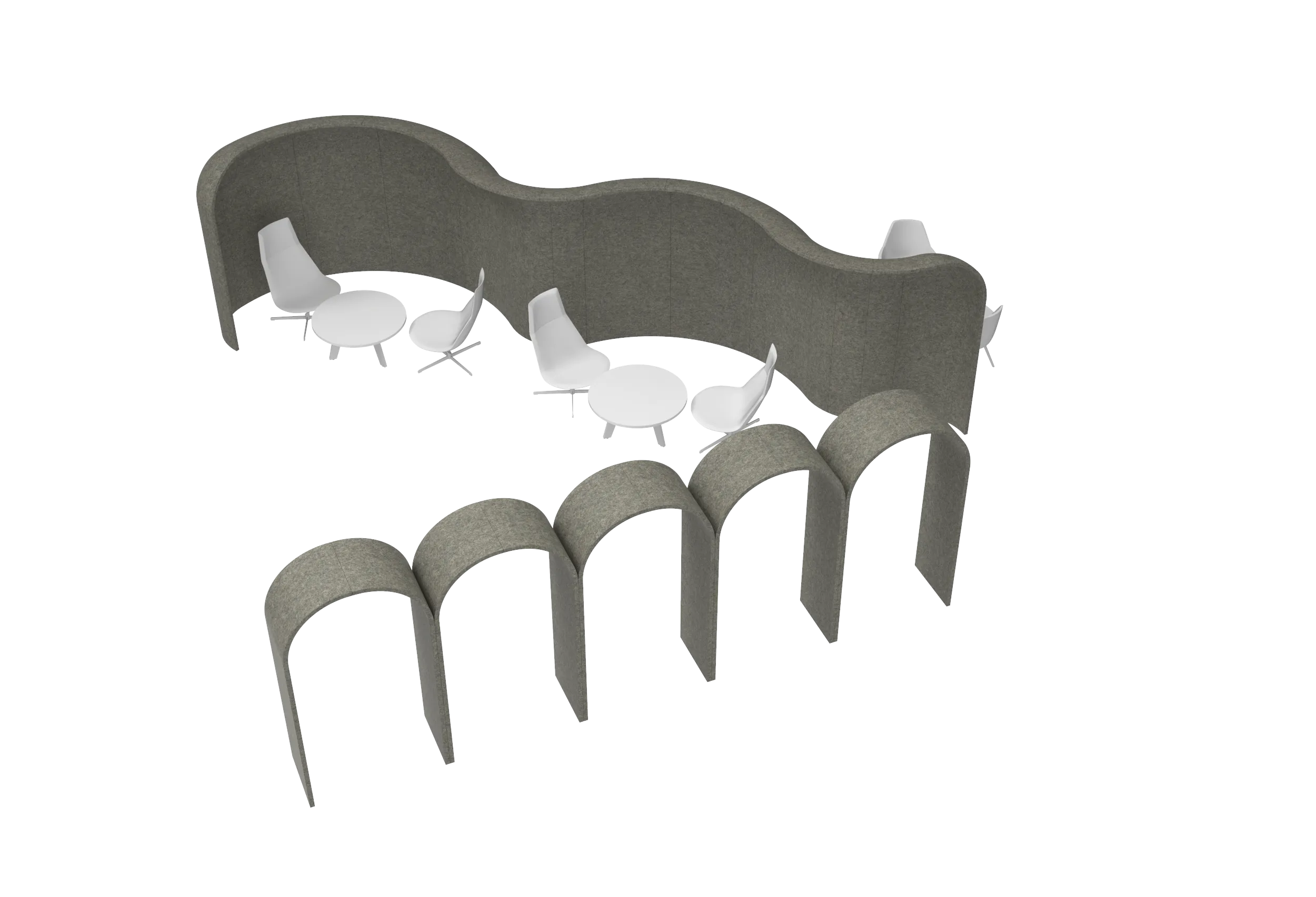 One kit, many configurations. The same 24 pieces reconfigured in multiple forms demonstrating the flexibility of Aeonica to work as enclosures, semi-enclosures, space-makers and linear separators.
