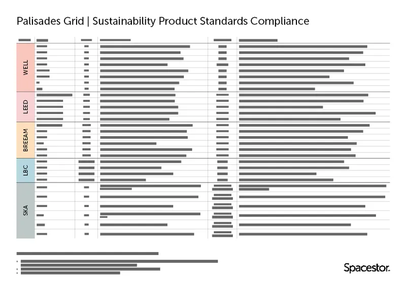 We know that navigating sustainability standards can feel overwhelming, which is why Palisades Grid comes with a downloadable Environmental Data Sheet to give you clear insight into its impact — [Download Here]. For a deeper understanding, we also provide a Sustainability Standards Compliance document—available upon request—that helps you make sense of the complex world of sustainability benchmarks, see example on the left. We encourage you to reach out to us directly to access this resource and explore how our commitment to sustainable design can support your decisions.