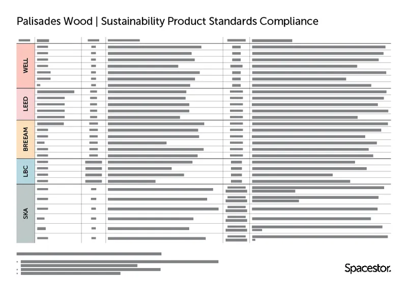 We know that navigating sustainability standards can feel overwhelming, which is why Palisades Wood comes with a downloadable Environmental Data Sheet to give you clear insight into its impact — [Download Here]. For a deeper understanding, we also provide a Sustainability Standards Compliance document—available upon request—that helps you make sense of the complex world of sustainability benchmarks, see example on the left. We encourage you to reach out to us directly to access this resource and explore how our commitment to sustainable design can support your decisions.