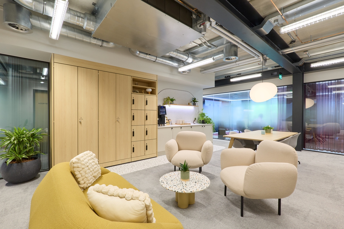 Lighting plays a key role in shaping the experience of the space — particularly within the Portals, where a warm glow enhances their inviting, cocoon-like feel. Together, these elements create an environment that feels sophisticated yet approachable, supporting wellbeing alongside performance.