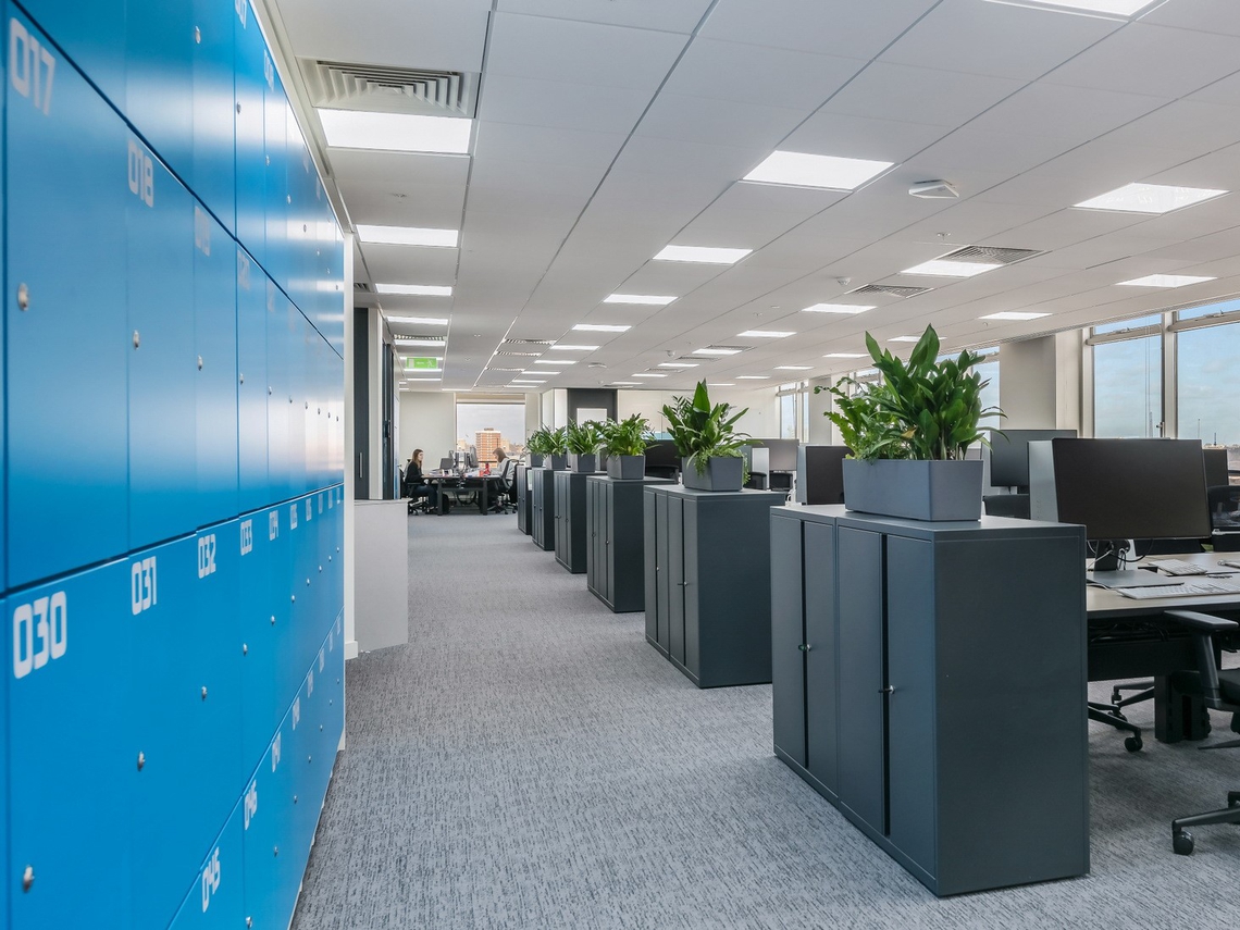 Spacestor installed some of our Storagewall as well as two suites of HotLockers: one suite’s in deep purple, the other’s in electric Formula-E blue, and both are boldly numbered so that they become major graphic features. With these bright interiors, the race car, the bespoke trophy cabinet, the racing simulators in the breakout area, and the magnums of champagne in the kitchen, this is truly a space for winners.
