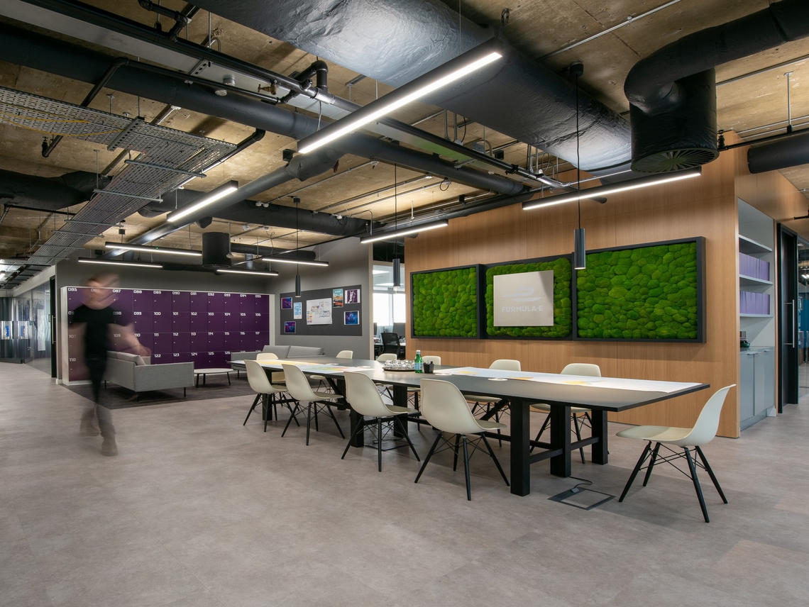 For their new headquarters in Hammersmith, the Formula E team required a social, very high-tech space to showcase their passion for racing and commitment to sustainability.